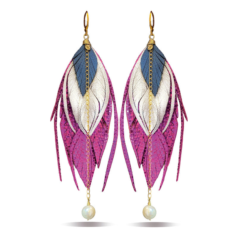 Aretes multipluma 13 cm rosa metálico Vangania artesanales