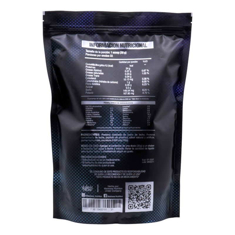 Es marca destacada: No Marca: Madness Contiene lactosa: Sí Es libre de gluten: Sí Es marca TOM: No Es vegano: No Condición del ítem: Nuevo Línea: Dama, Caballero Suplemento principal: Proteína Edad mínima recomendada: 18 años Peso neto: 1 kg Tipo de envase: Bolsa Características del producto: Con vencimiento Formato de venta: Unidad Peso de la porción: 30.3 g Clase de suplemento: Proteínas Formato del suplemento: Polvo Función del suplemento: Nutricional/Deportivo Nombre comercial: Izo Zero Premium Protein Unidades por pack: 1 El costal de proteína isolate Madness de 1 kilogramo es un suplemento deportivo premium diseñado para quienes buscan alcanzar un nivel superior en rendimiento, fuerza y nutrición. Formulado con proteína de alta pureza, ofrece un perfil limpio y efectivo que se adapta a las exigencias de atletas, deportistas y personas que desean mantener un estilo de vida saludable.