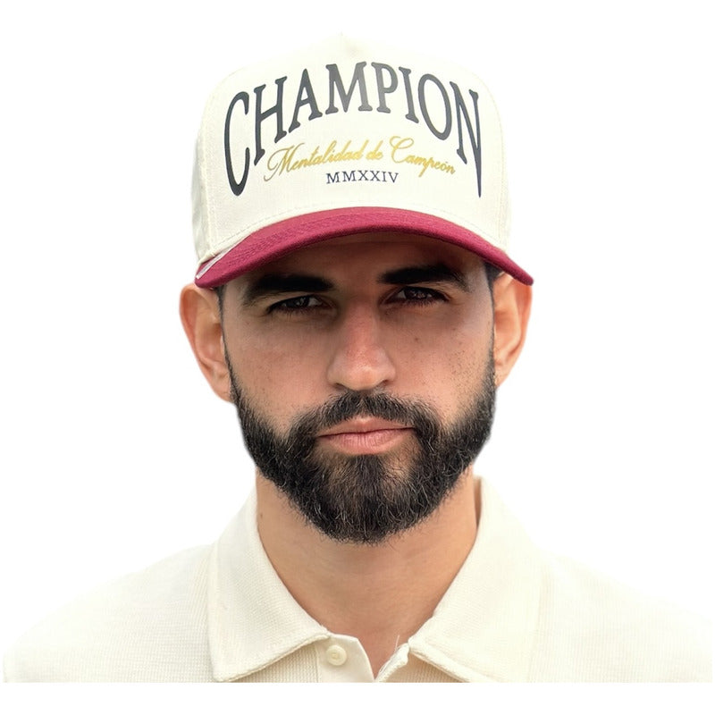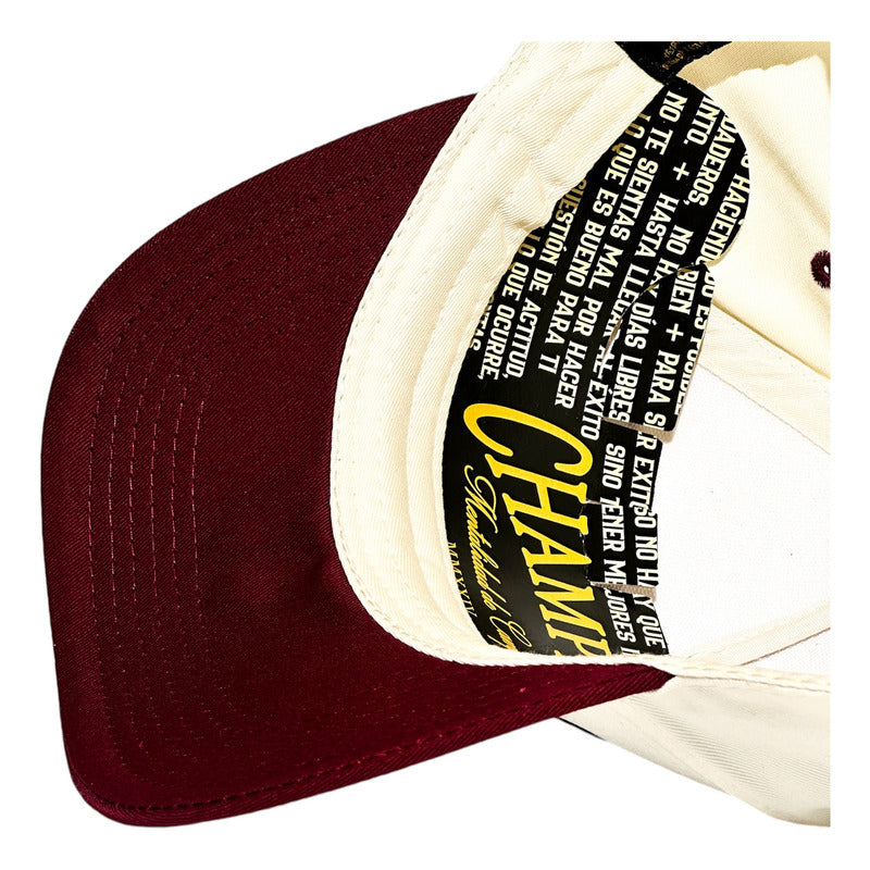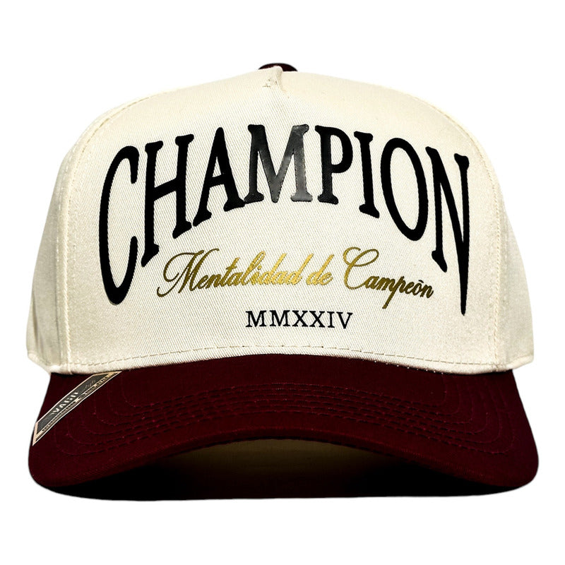 Material Premium:Estampada artesanalmente al frente lettering en vinil negro Champion, Mentalidad de Campeón en dorado, Dos mil veinticuatro en números romanos. Estampado posterior: Logo VS en color negro. Gorra de 5 paneles color marfíl con visera tinta snapback en gabardina.