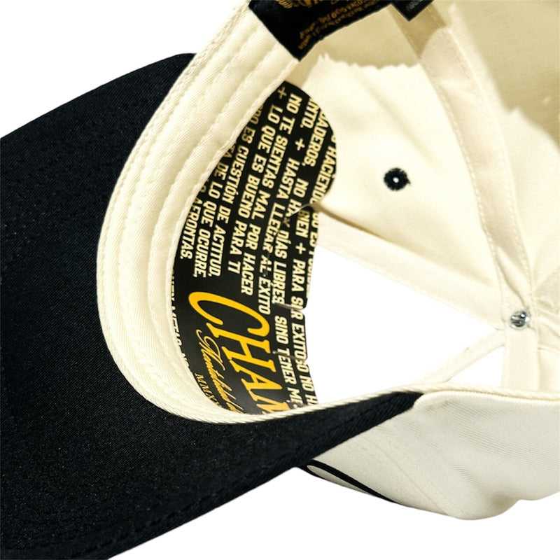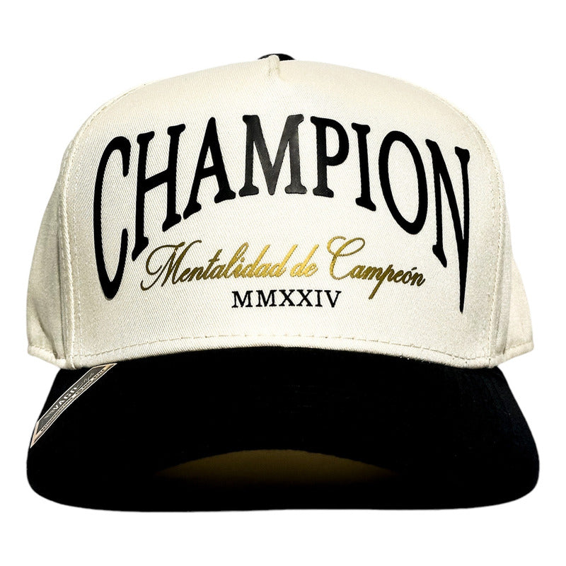 Material Premium:Estampada artesanalmente al frente lettering en vinil negro Champion, Mentalidad de Campeón en dorado, Dos mil veinticuatro en números romanos. Estampado posterior: Logo VS en color negro. Gorra de 5 paneles color marfíl con visera negra snapback en gabardina.