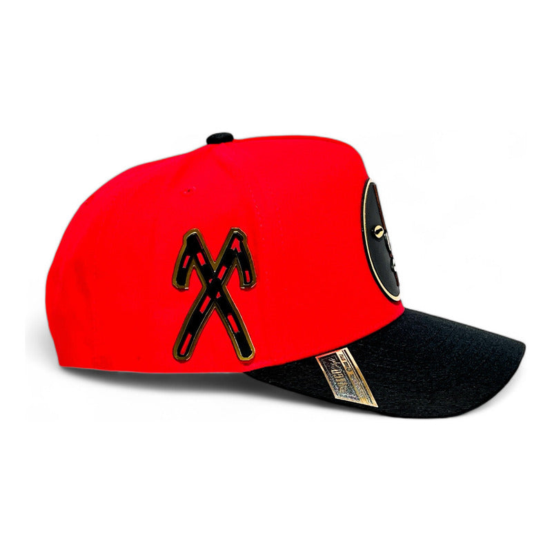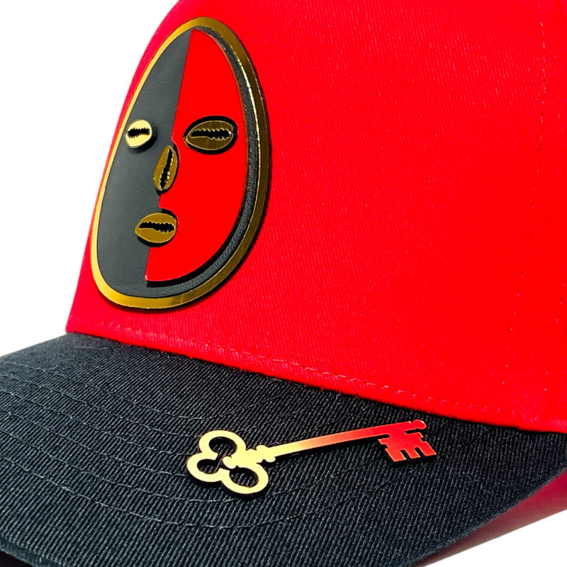 Material Premium: Estampada artesanalmente al frente imagen de Eleggua en piel natural de res negra y roja con detalles en placa dorada. En lateral: Garabato de Eleggua en piel de res natural roja con detalles en placa dorada. Visera: Llave dorada en metálico dorado. Gorra de 5 paneles negra snapback de visera curva elaborada en tela de gabardina roja con visera de color negro.