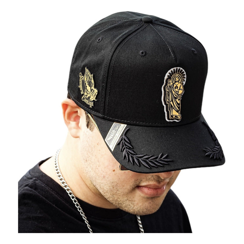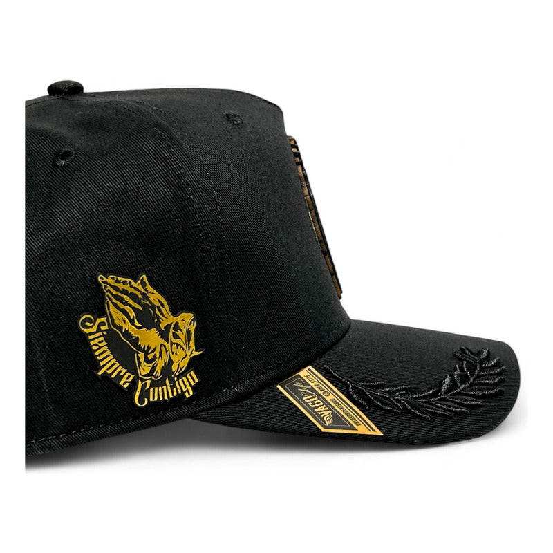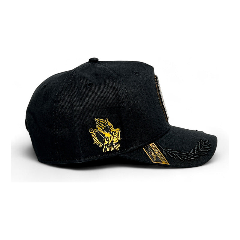 Material Premium:Estampada artesanalmente al frente imagen de San Judas Tadeo grabada en placa dorada, montada en piel natural de res color negro. En lateral: Manos rezando en placa dorada con leyenda “Siempre Contigo". Gorra de 5 paneles negra snapback de visera curva elaborada en tela de gabardina con bordado de laureles negros.