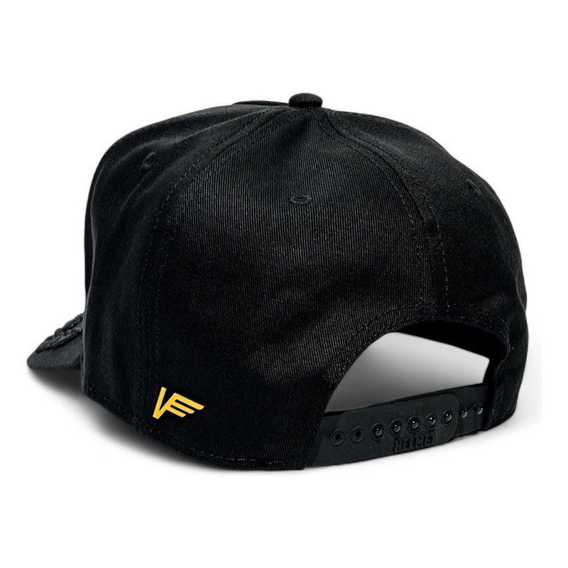 Visera Curva: La visera curva añade un toque muy actual con horma de copa alta de 5 paneles en gabardina negra con laureles bordados en visera en hilo negro.