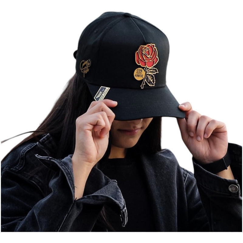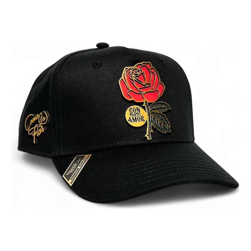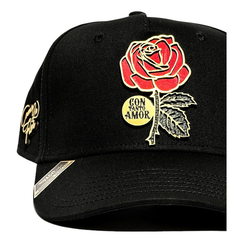 Material Premium:Estampada artesanalmente al frente una rosa en piel de res natural roja y verde lettering “Con tanto Amor” y contorno en placa dorada. Lateral: Como la Flor en placa dorada montada sobre piel de res natural negra. Gorra de 5 paneles snapback en gabardina color negra.