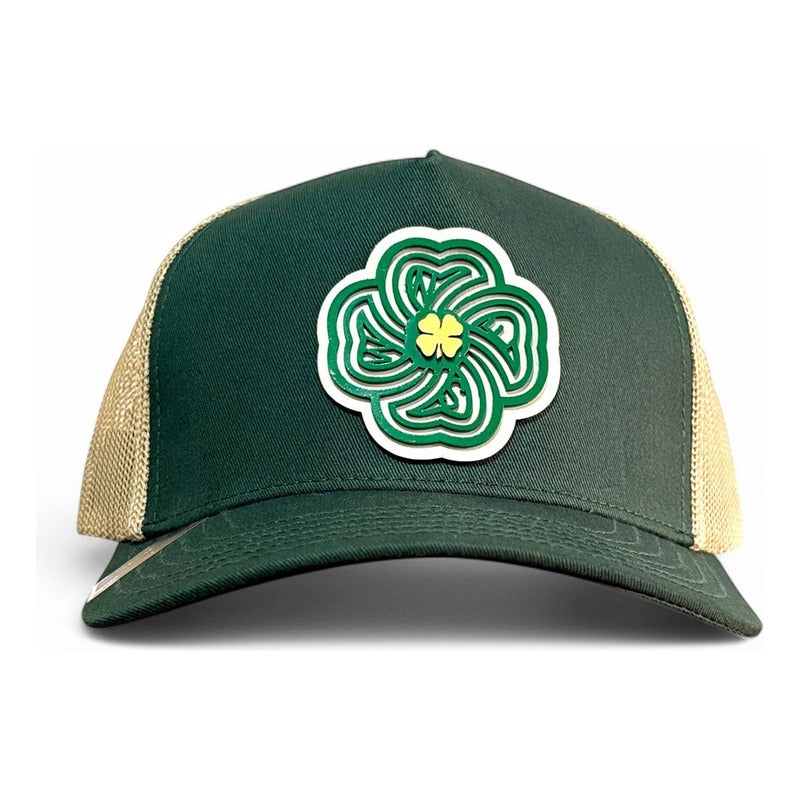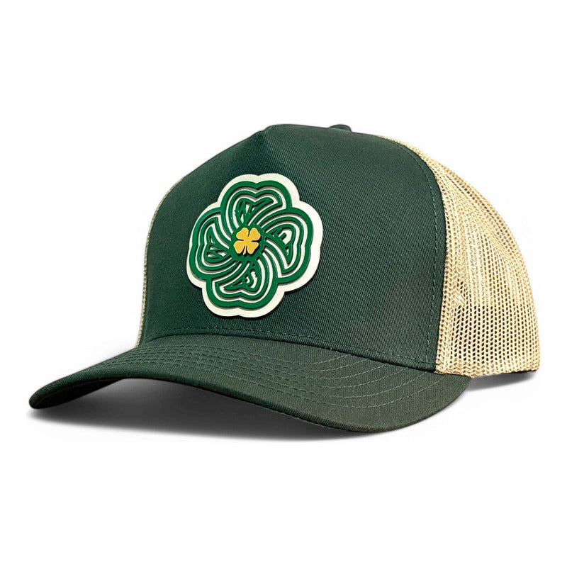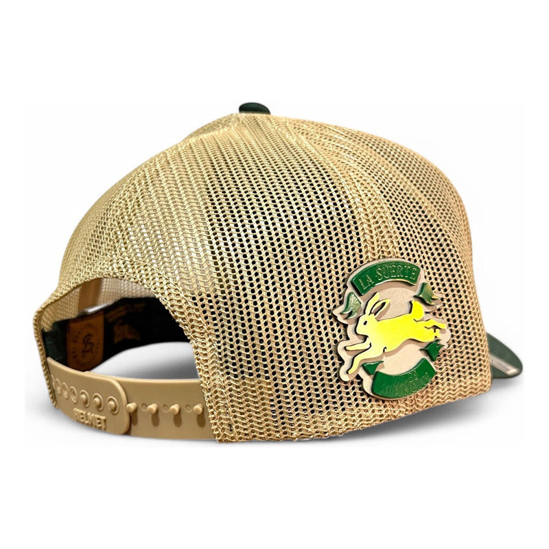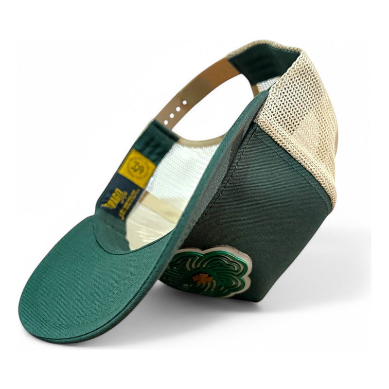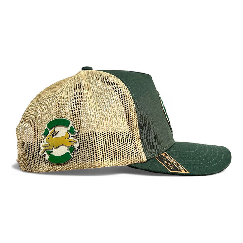Material Premium: Estampada artesanalmente al frente trébol de 4 hojas en placa dorada sobre otro trébol de 4 hojas en placa color verde sobre piel de res natural color marfil. En lateral: La suerte no es suficiente en estandarte verde y un conejo sin pata trasera en placa dorada montados sobre piel de res natural color marfil. Gorra 5 panels verde obscuro con puntadas de color dorado snapback de visera curva elaborada en tela de gabardina con malla dorada.