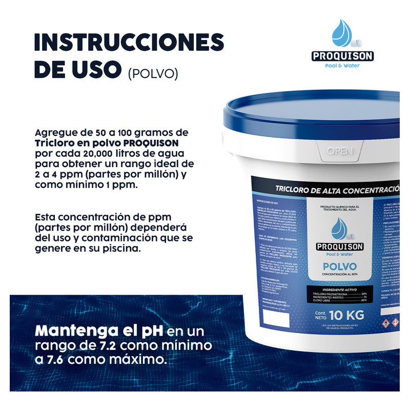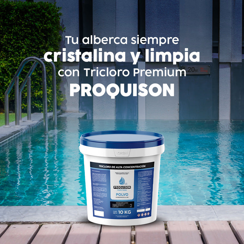 El Cloro para alberca en polvo Proquison es la mejor solución para mantener el agua de tu alberca, piscina, jacuzzi o spa completamente limpia y libre de microorganismos. Este producto contiene tricloro concentrado al 90%, lo que garantiza una desinfección eficaz y prolongada. Gracias a su fórmula estabilizada, elimina bacterias, hongos y materia orgánica, asegurando que el agua permanezca cristalina y libre de olores desagradables.
