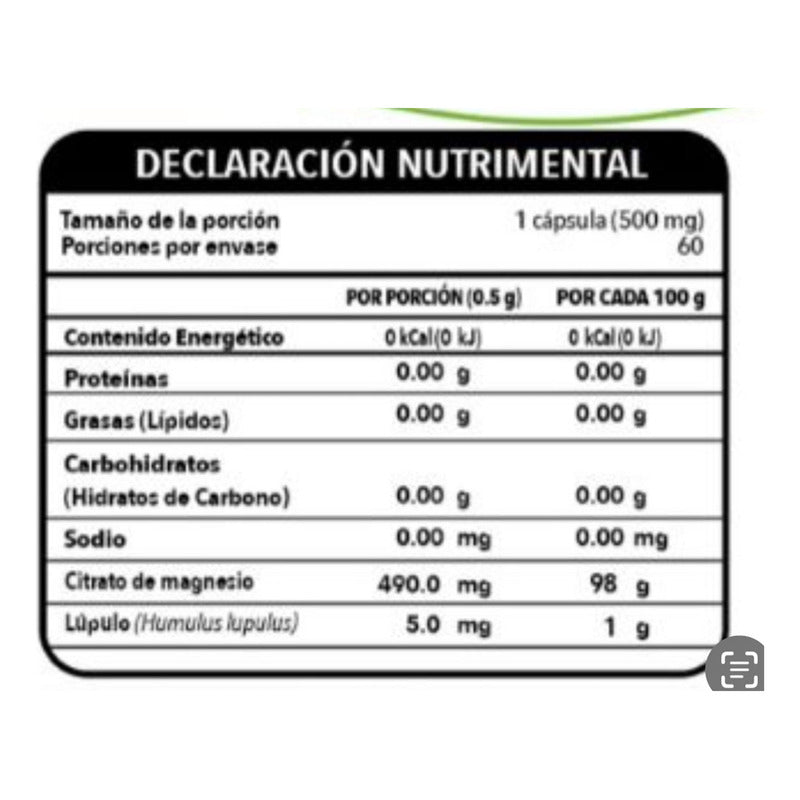 Además de magnesio 500 mg, cada cápsula contiene lúpulo y estearato de magnesio, potenciando su efecto relajante y de apoyo al bienestar general. Es un producto sin gluten ni lactosa, lo que lo hace apto para personas con restricciones dietéticas. Sin embargo, no es apto para veganos.