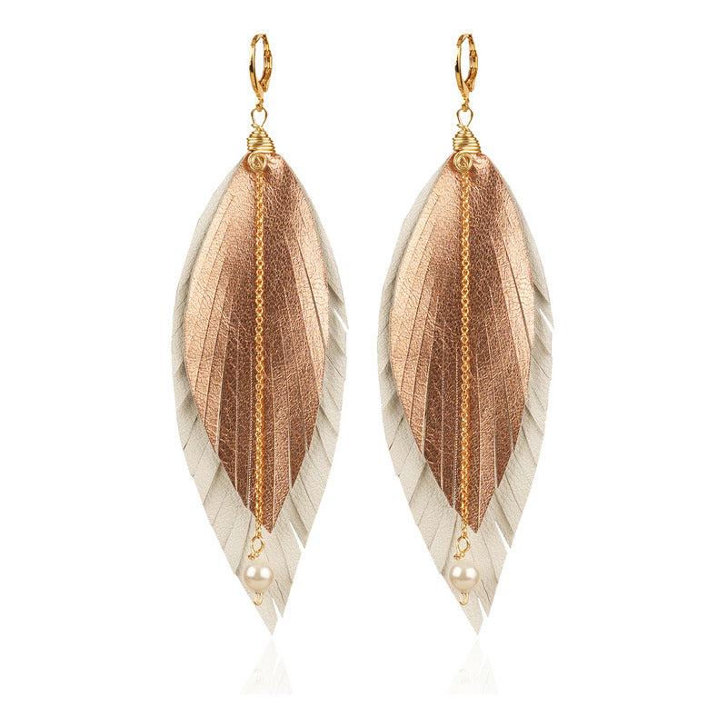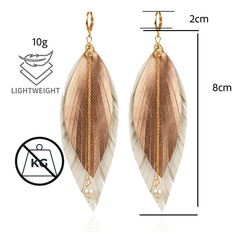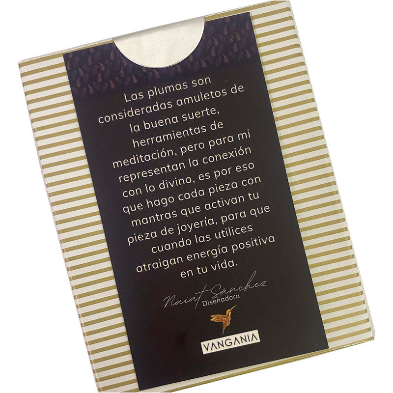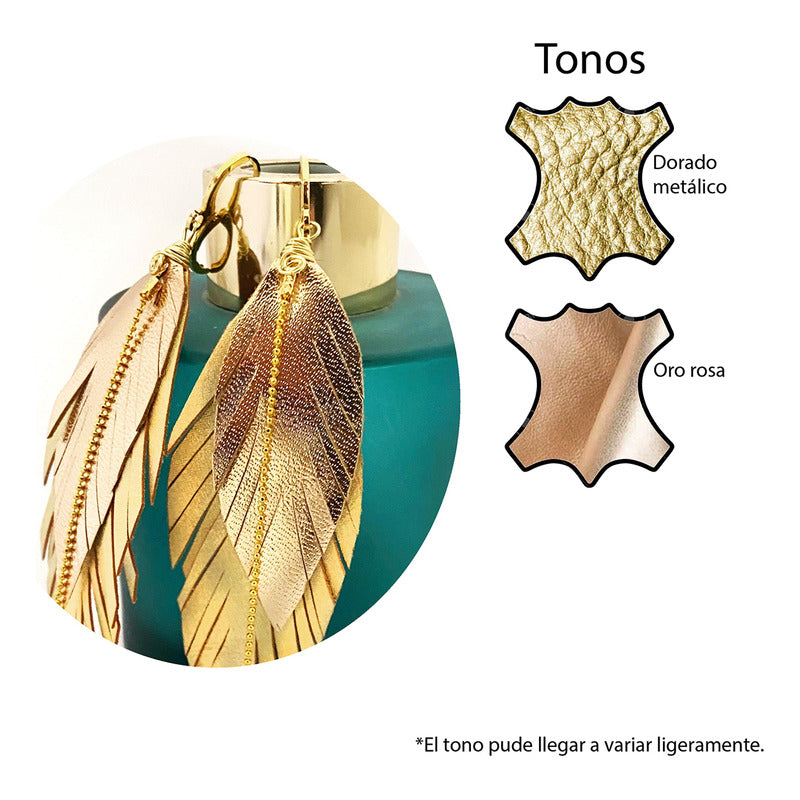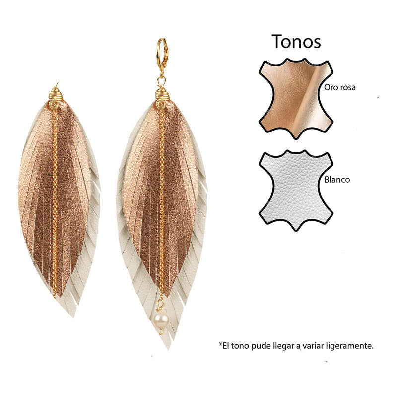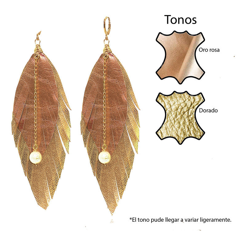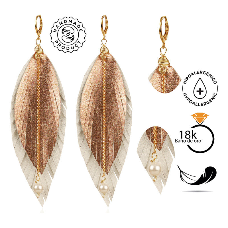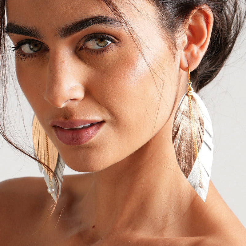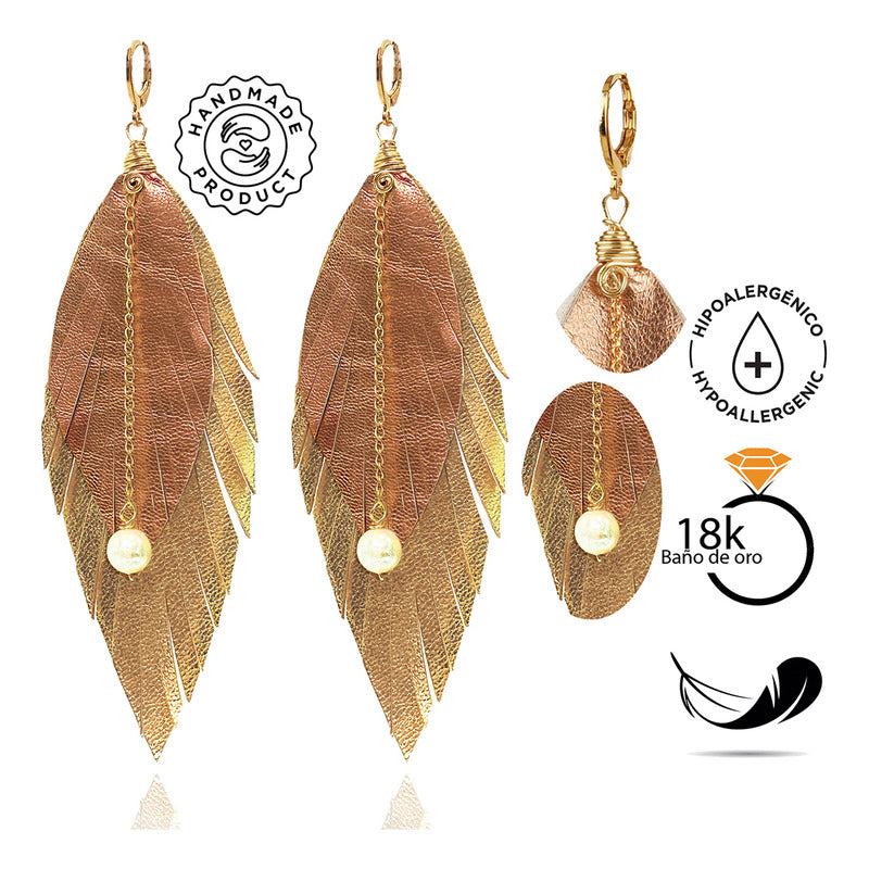 "Luce auténtica con los aretes mujer Elegant Gold de Vangania, una joya artesanal que fusiona tradición, estilo y simbolismo. Esta pieza está hecha con cuero vacuno 100% cortado a mano, en forma de pluma, símbolo universal de libertad, renovación y protección espiritual. Su diseño incluye una cadena de 8 cm en baño de oro 18k con aplicación de perla mayorca, que aporta un toque elegante y atemporal a cualquier atuendo, además de darte un look BOHO CHIC sofisticado.