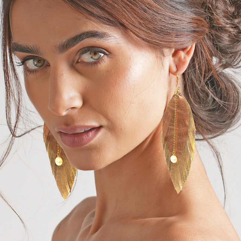 Aretes Largos Mujer De Plumas Dorados Joyeria Mujer Vangania