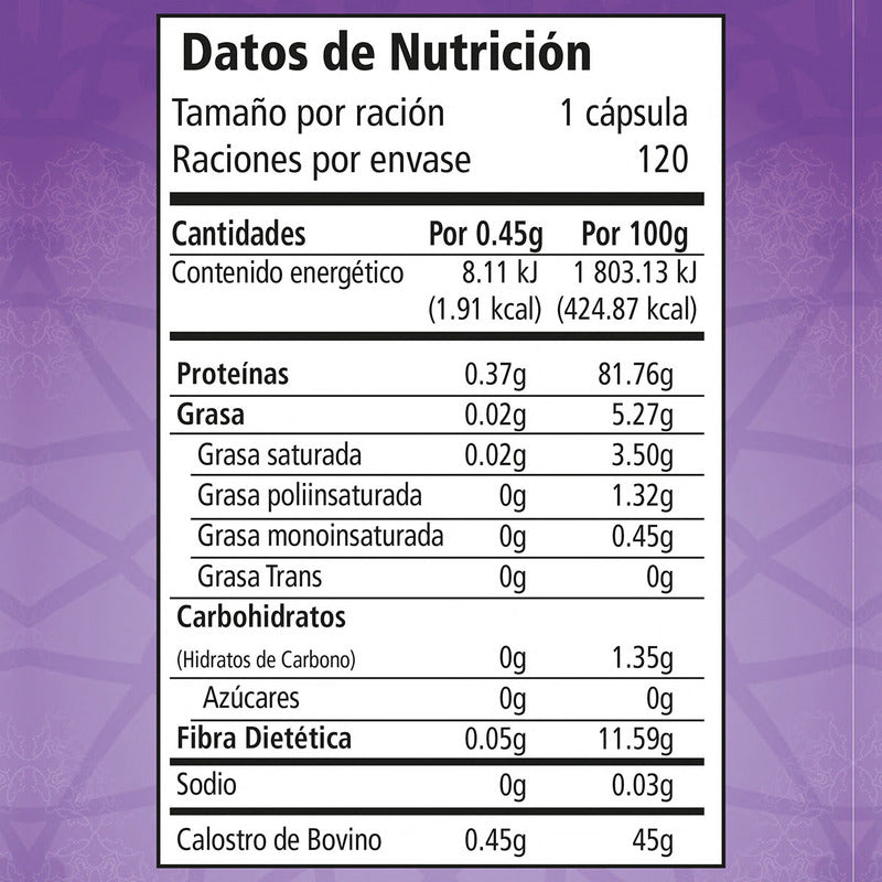 Su fórmula simple, con un solo ingrediente activo, está pensada para quienes buscan apoyo inmunológico y bienestar general sin complicaciones ni mezclas innecesarias. Cada cápsula aporta 450 mg de calostro bovino, y el frasco contiene 120 cápsulas, con un rendimiento aproximado de 40 días al utilizar 1 cápsula antes de cada alimento.