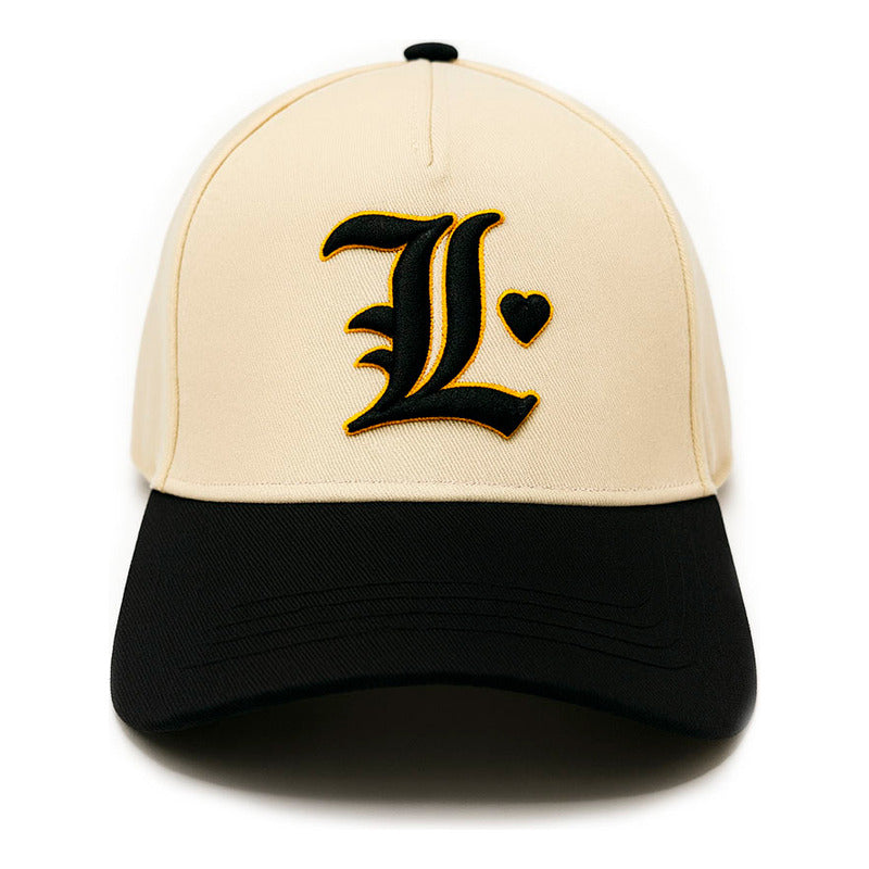El bordado 3D de la palabra “L” en letra gótica destaca con textura y profundidad, aportando un toque distintivo que equilibra elegancia y fuerza visual.