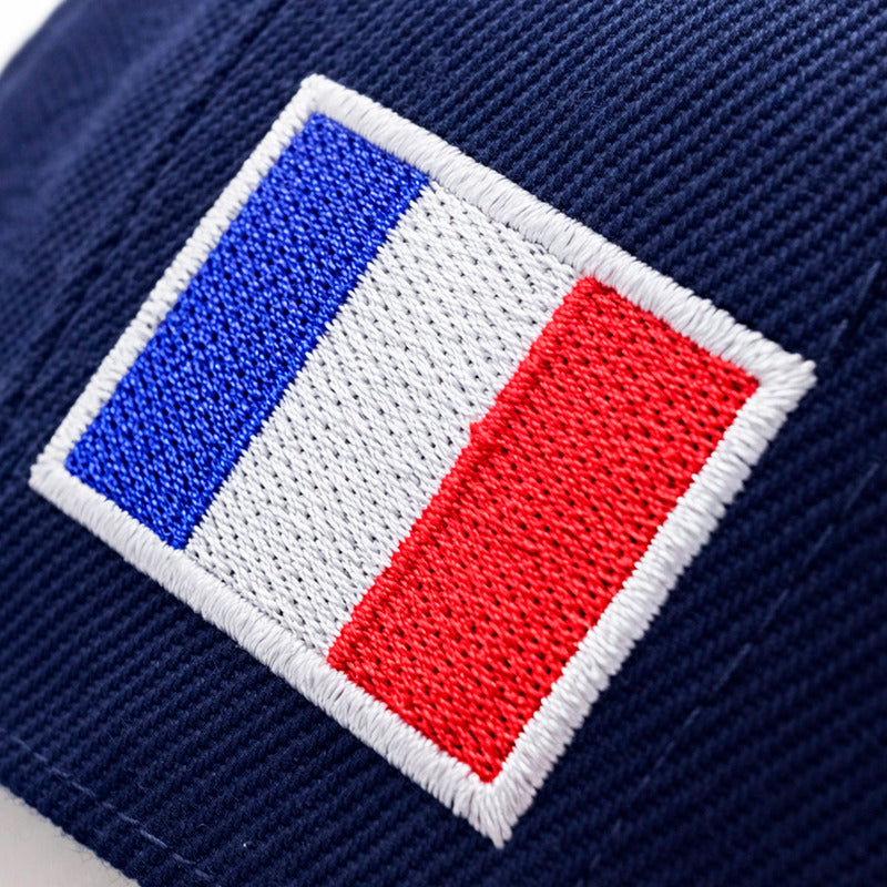 Diseño Conmemorativo 2026 La calidad se impone a primera vista. El frente exhibe un bordado en relieve 3D (Puff) con el texto "WORLD CUP 2026" en blanco brillante, creando un contraste elegante sobre el fondo oscuro. La identidad nacional se refuerza con detalles exclusivos: la Bandera Tricolor (Azul, Blanco, Rojo) bordada con precisión en el costado derecho y la palabra "FRANCE" bordada sobre el arco trasero. Es una prenda que habla de orgullo desde cualquier ángulo.