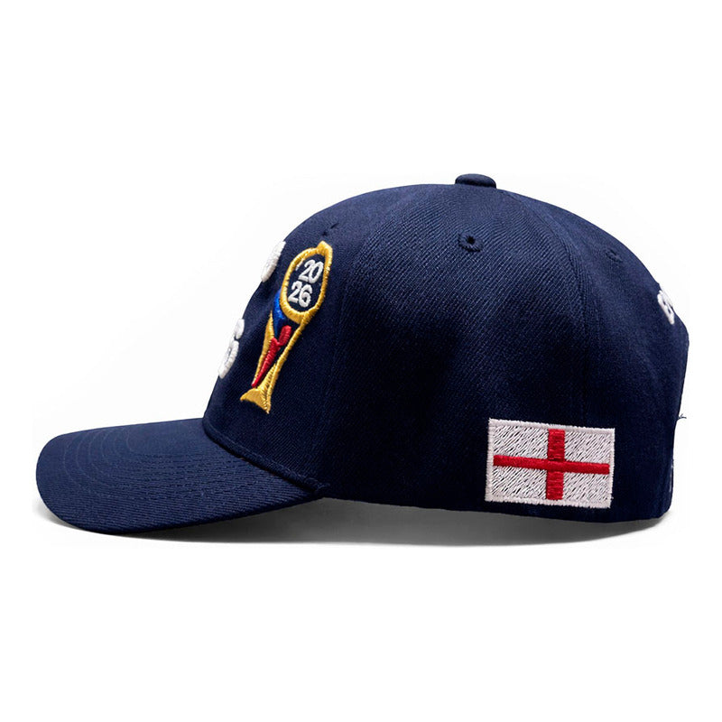 Diseño Conmemorativo 2026 El bordado frontal es el protagonista indiscutible. Con la técnica de relieve 3D (Puff) en color blanco brillante, el texto "WORLD CUP 2026" resalta perfectamente sobre el fondo azul oscuro. Pero lo que realmente define a esta gorra son sus detalles de identidad: la Bandera de la Cruz de San Jorge bordada en el costado derecho y la palabra "ENGLAND" bordada sobre el arco trasero. Es una declaración de lealtad a los "Tres Leones".