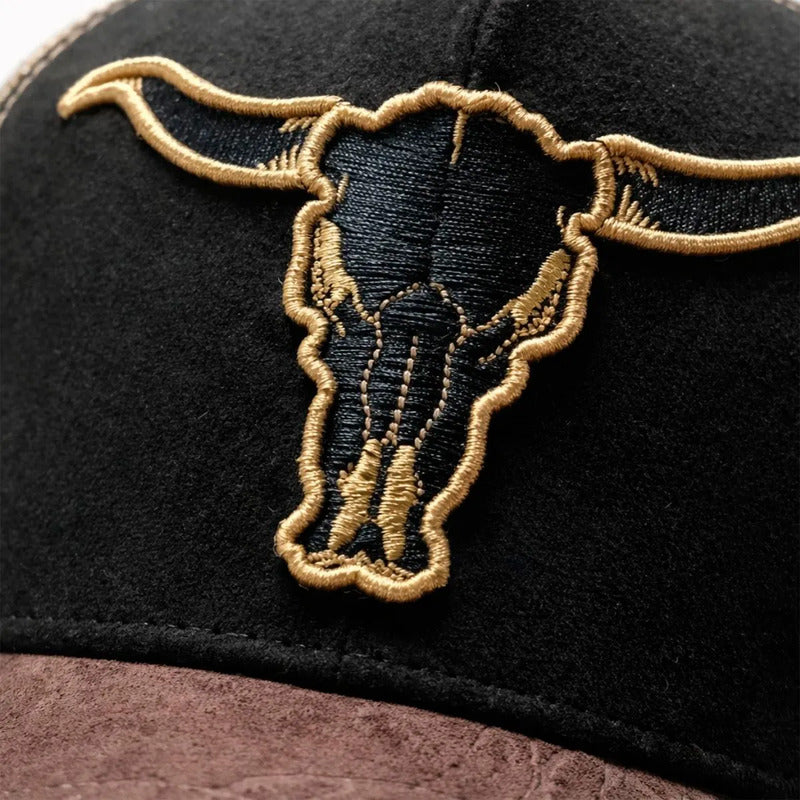 El nombre lo dice todo. "Black Dominion" presenta un Parche Frontal de Lujo con la figura esculpida de un Cráneo de Toro Longhorn en acabado bronce antiguo. Este símbolo de resistencia y poder ancestral resalta magníficamente sobre el panel frontal negro, atrayendo miradas de respeto. Como sello de autenticidad, incorpora un Pin Metálico "Stampede Ranch" en la malla lateral.