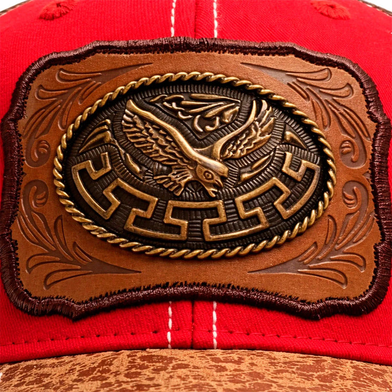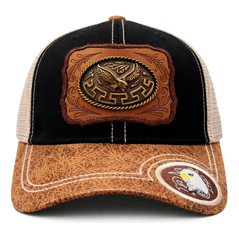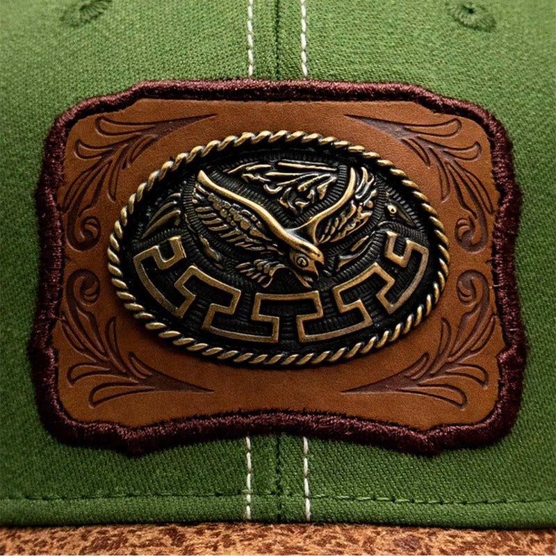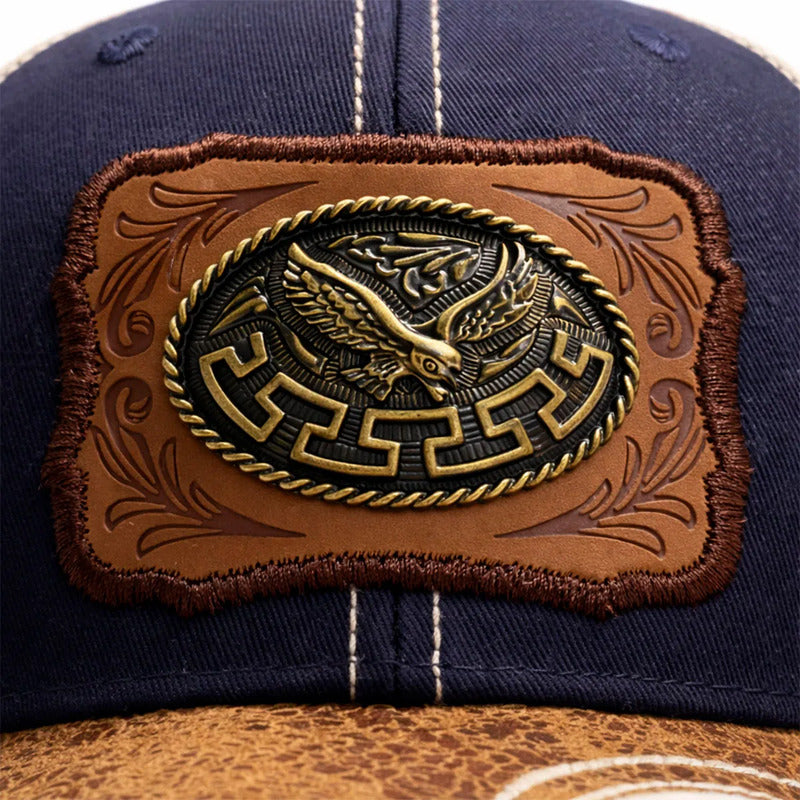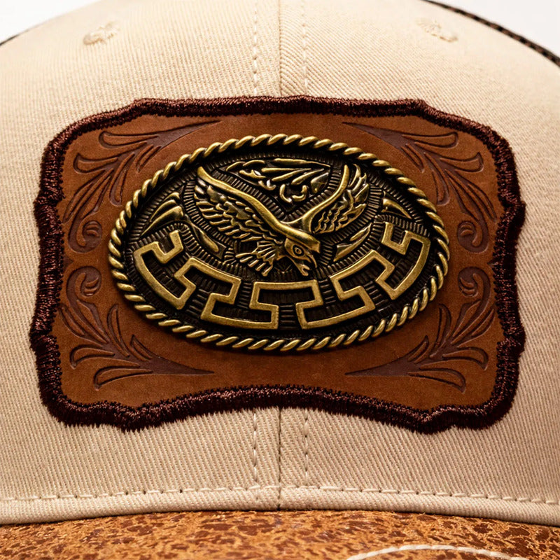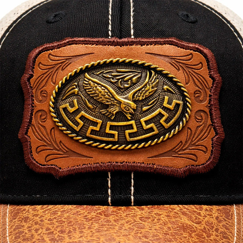 No es un simple bordado; es una joya. El frente de la gorra presenta un parche de piel sintética con grabados ornamentales clásicos, sobre el cual se asienta un Herraje Metálico (Placa) con la figura detallada de un Águila Real con las alas extendidas. El acabado en metal antiguo (bronce/oro viejo) resalta cada pluma, otorgándole una presencia y un brillo que imponen respeto.
