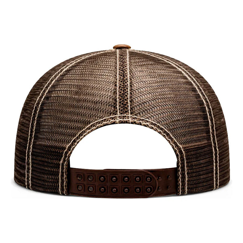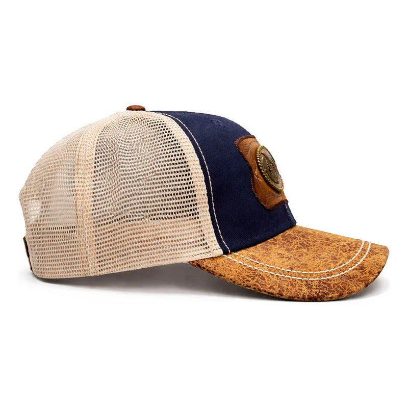 La calidad se siente al tacto. La visera curva destaca por su acabado especial que imita la piel desgastada o crackelada, brindando esa apariencia de "uso rudo" y autenticidad vintage desde el primer día. Este material robusto se equilibra con la ligereza de los paneles traseros de malla, diseñados para ofrecer máxima ventilación y frescura bajo el sol.