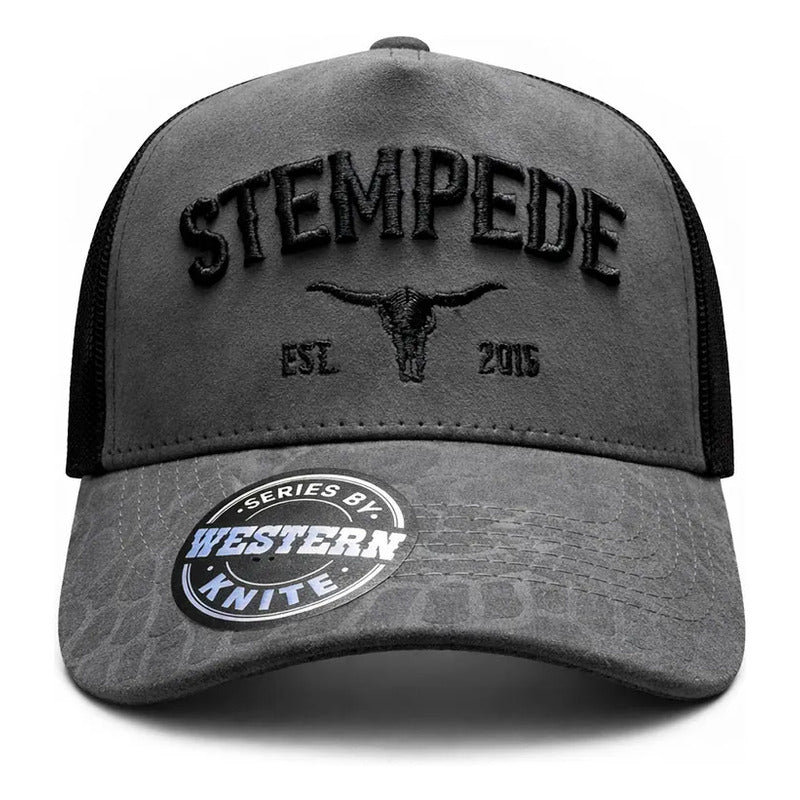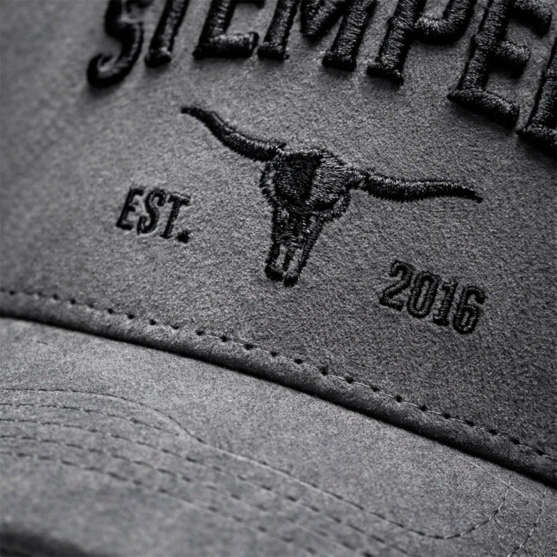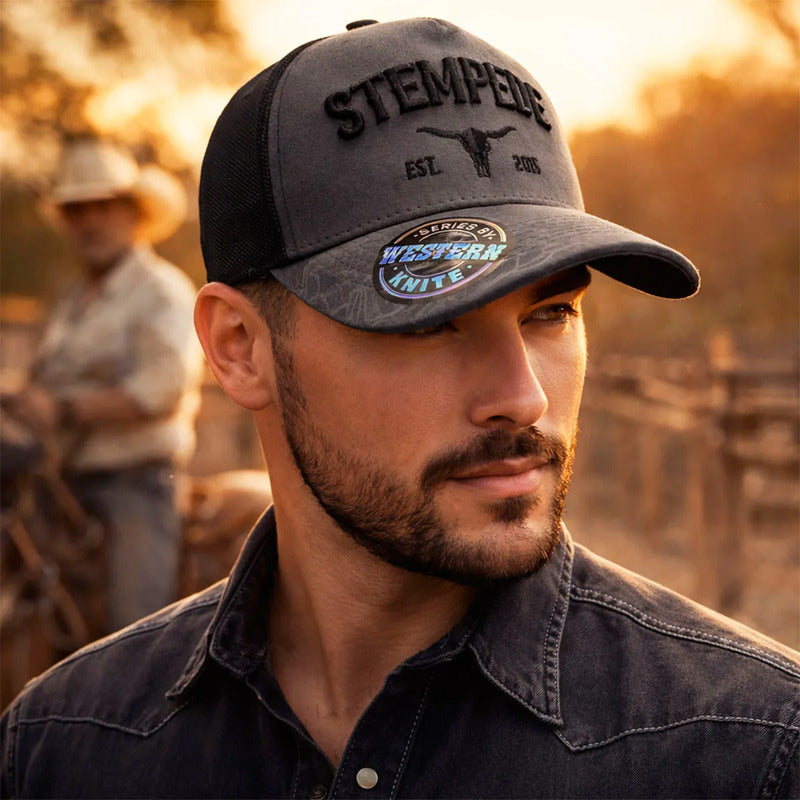 El modelo "Steel Ranch" se inspira en las estructuras metálicas de los corrales y la maquinaria de trabajo pesado. El frente luce un Parche con Cráneo de Toro en relieve, un ícono de resistencia ante la adversidad. La paleta de colores en Gris Acero y Negro le otorga una apariencia sobria y "limpia", fácil de combinar tanto con ropa de trabajo como con outfits urbanos de fin de semana.