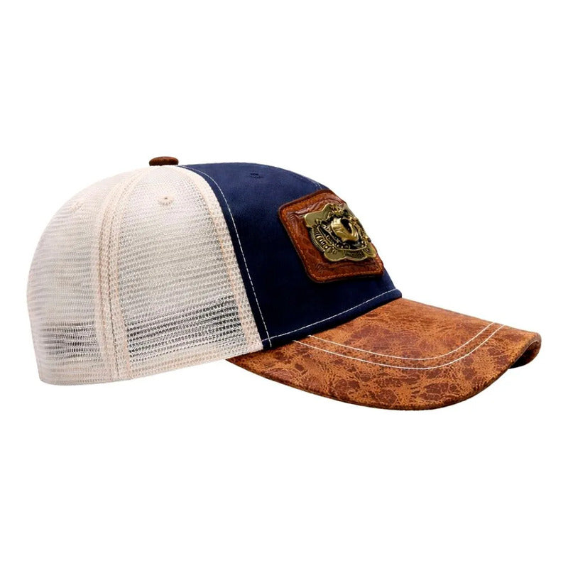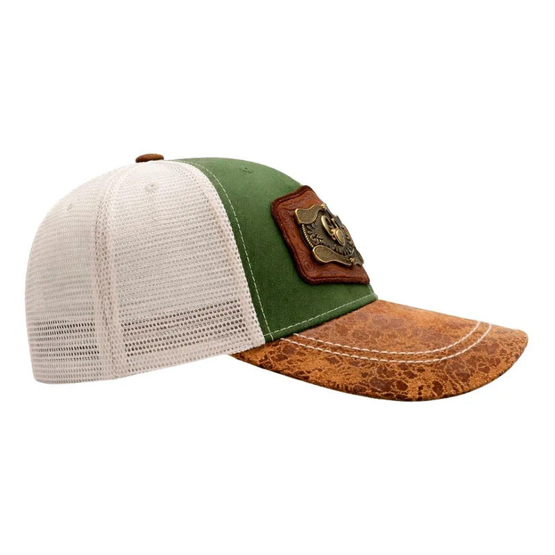 La parte posterior cuenta con la clásica malla de estilo trucker que facilita la circulación del aire siendo ideal para climas cálidos o jornadas largas. Su visera curva con acabados decorativos no solo protege del sol sino que añade un toque rústico sofisticado que recuerda a las marcas más exclusivas del mercado regional.