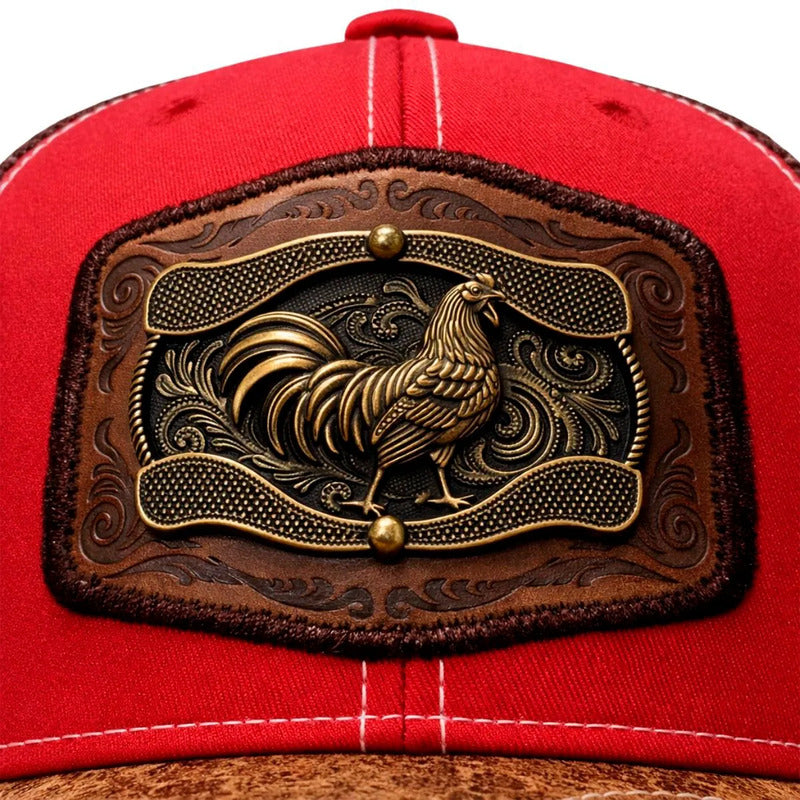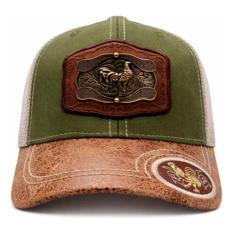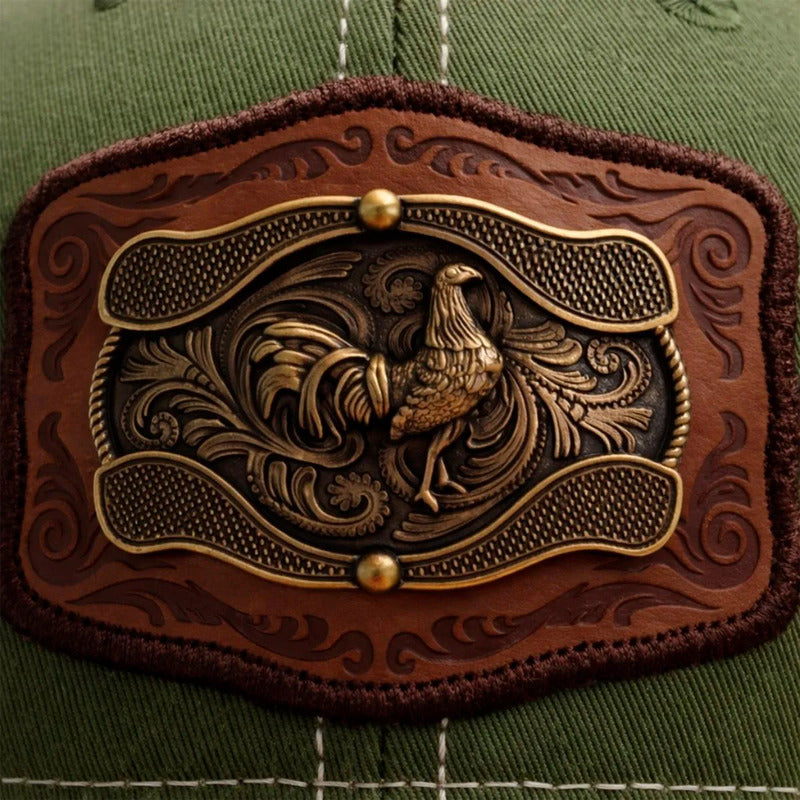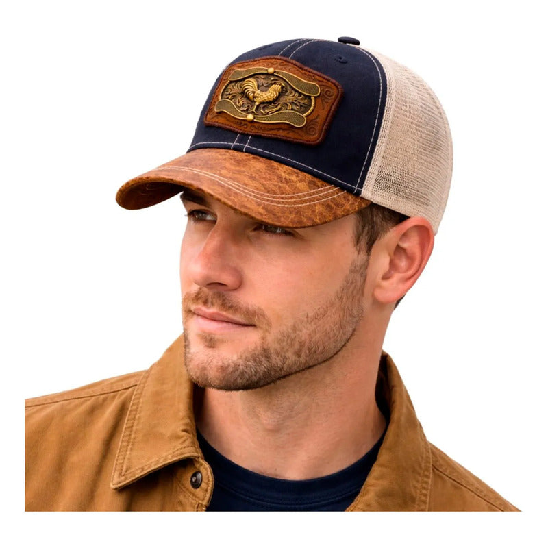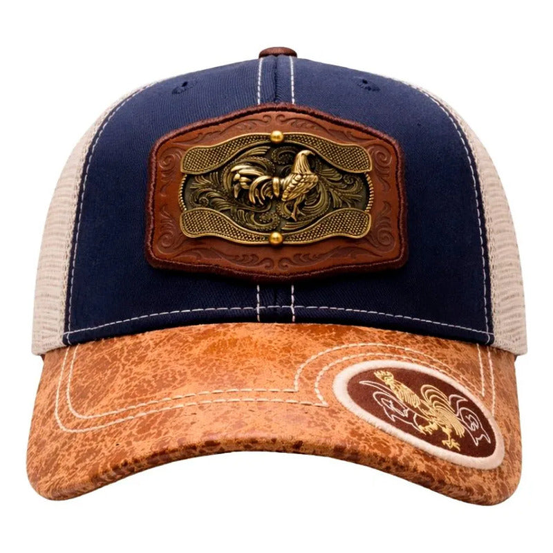 Confeccionada con materiales textiles de alta durabilidad esta gorra presenta un panel frontal rígido que mantiene su forma impecable con el paso del tiempo. El detalle principal es un herraje ornamental con relieve de gallo que captura la mirada y refuerza la personalidad de quien la porta convirtiéndola en un elemento distintivo de tu vestimenta.