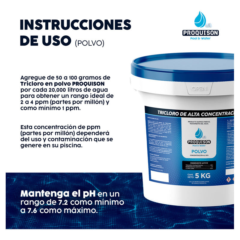 El Tricloro en polvo Proquison cumple con todos los estándares de calidad y normativas de seguridad, lo que garantiza su eficacia y seguridad para los usuarios. Mantén el agua de tu alberca lista para el disfrute de tu familia y amigos con el poder desinfectante del cloro en polvo Proquison.