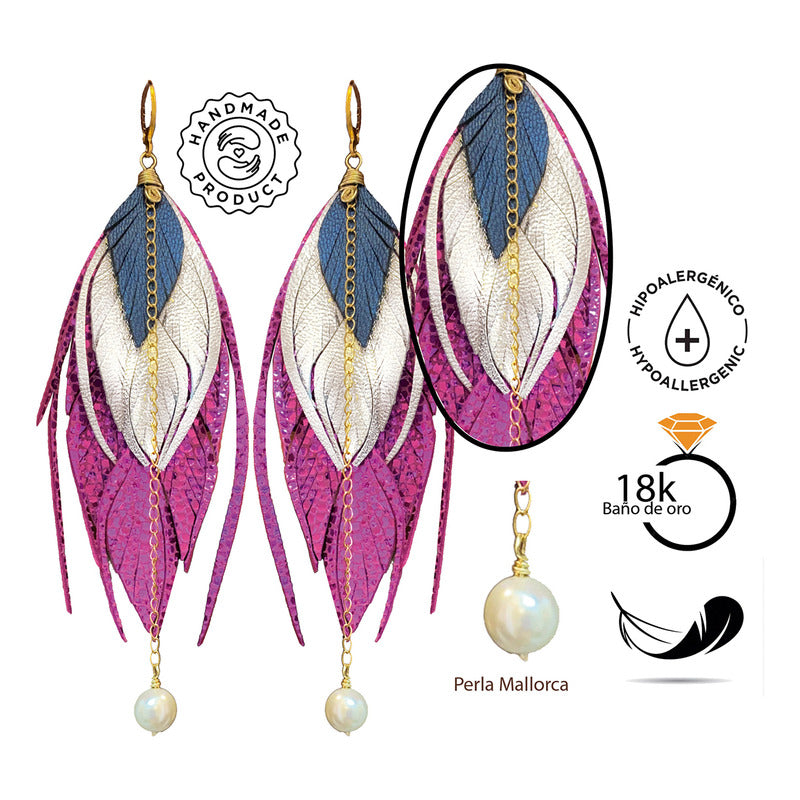 "Explora la elegancia y originalidad de los Aretes pluma Rosa Metálico de VANGANIA, una joya artesanal única, pensada para mujeres que valoran el diseño mexicano de alta calidad. Fabricados a mano en talleres locales, estos aretes están elaborados con cuero vacuno 100% cortado a mano, lo que garantiza que cada pieza sea irrepetible. Su diseño de plumas alargadas (13 cm de largo) combina tonos rosa metálico, azul marino y acabados dorados con cadena bañada en oro de 18K, acompañada por una aplicación de perla mayorca que aporta distinción.