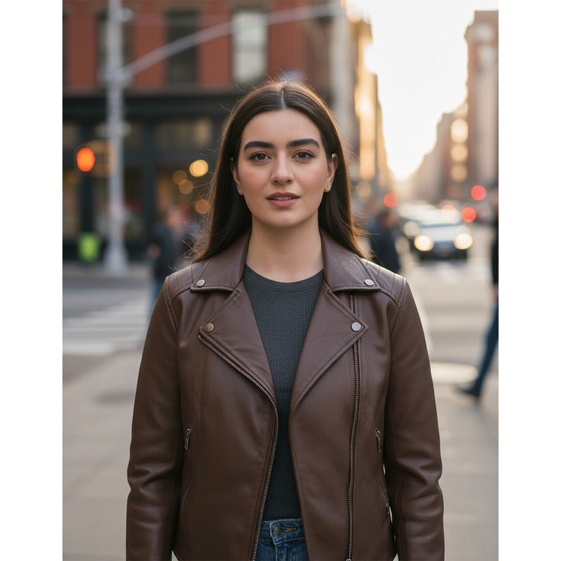 Su color café natural permite combinarla fácilmente con tonos neutros, grises o claros, aportando un equilibrio perfecto entre elegancia y fuerza. Gracias a la calidad de su construcción, la chamarra piel borrego mujer mantiene su forma y confort incluso con el uso constante.