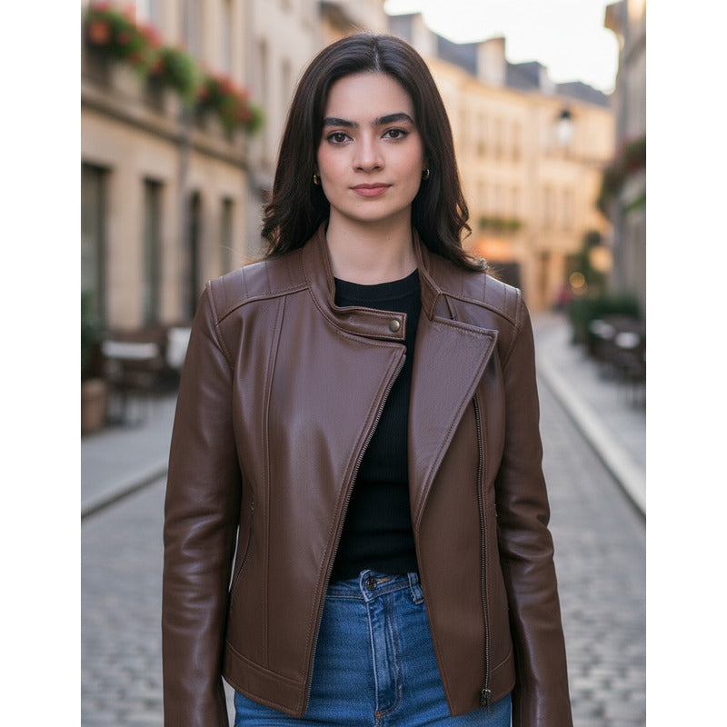 Diseñada en corte slim fit, estiliza la figura y permite lucirla abierta o cerrada. El cuello tipo mao redondo con broche snap, las costuras marcadas en hombros, y el estilo biker casual hacen de esta prenda un ícono versátil que se adapta tanto a días laborales como a salidas informales. Esta chamarra biker casual dama cuenta con cierres metálicos YKK, puños ajustables, bolsas laterales con cierre y un forro textil interior de gran resistencia.