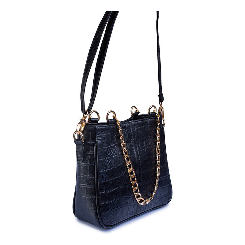 Bolsa Castelli Dama Croco Piel Genuina Correa Desmontable Negro Lisa Oro