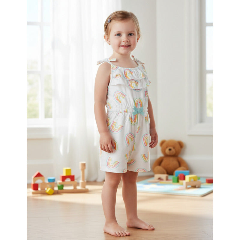 Haz que los días cálidos sean más cómodos y llenos de estilo para tu pequeña con este adorable romper Gerber blanco con diseño de arcoiris, ideal para bebés y niñas pequeñas. Diseñado especialmente para brindar libertad de movimiento, este overol combina suavidad y practicidad gracias a su confección 100% algodón, un material ligero, fresco y perfecto para primavera y verano. Su cuello tipo barco y mangas tipo tanque permiten que tu bebé se mantenga fresca, mientras que los broches en la parte interna del muslo facilitan los cambios de pañal sin complicaciones, incluso en movimiento.