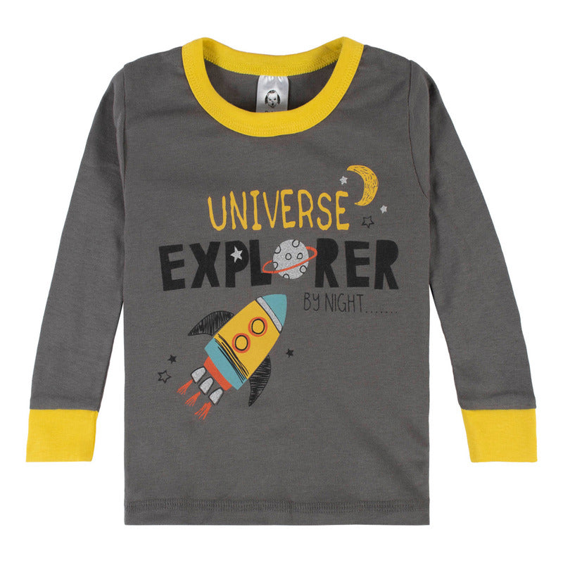 Disponible en tallas que van desde los 12 meses hasta los 5 años, este set pijamas para niño se adapta a distintas etapas del crecimiento. Los pantalones cuentan con cintura elástica suave que no aprieta, mientras que las camisetas se colocan y retiran fácilmente, facilitando la rutina tanto de los padres como de los niños. El diseño en tonos gris y negro le da un estilo moderno y versátil, ideal para cualquier hora del día.