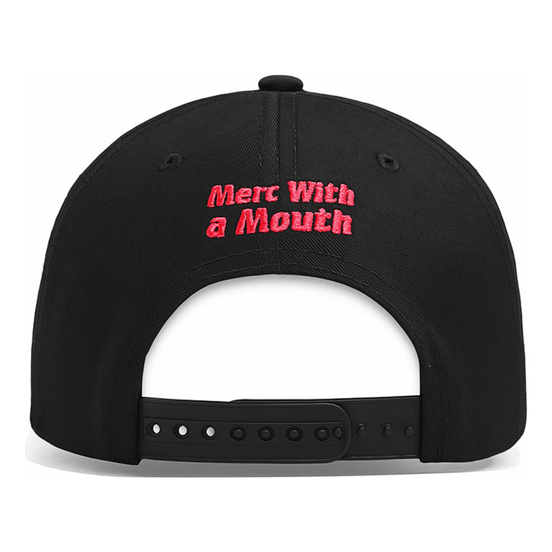 Con su base negra y visera plana, esta gorra snapback incorpora el icónico símbolo de Deadpool al frente en emblema texturizado, y parches laterales con los logotipos de la franquicia. También cuenta con ilustraciones holográficas en la parte inferior de la visera, lo que la convierte en una pieza de alto impacto visual y un objeto de colección que destaca por su autenticidad.