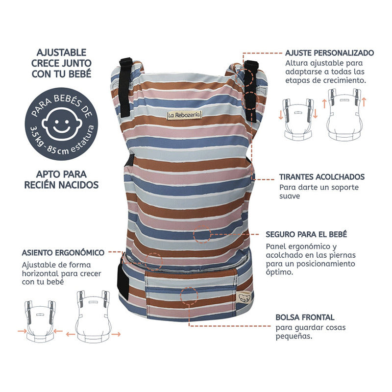 El diseño incluye posiciones de porteo al frente, en la espalda y también para amamantar, adaptándose a las necesidades del día a día. Cada detalle ha sido pensado para brindar una experiencia práctica tanto para el bebé como para el adulto. Los tirantes acolchados con cubretirantes desmontables y cintas ajustables proporcionan soporte eficiente, mientras que el cinturón, también acolchado, se adapta hasta los 130 cm e integra un bolsillo frontal funcional.