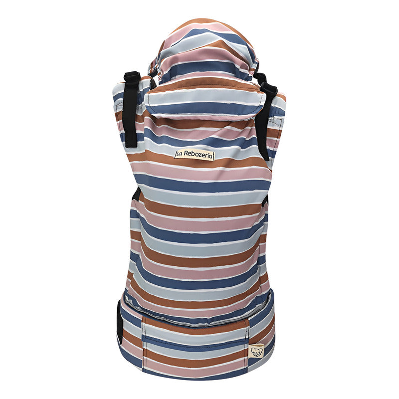Uno de los elementos distintivos es el gorro integrado para proteger del sol, que se guarda fácilmente en el compartimento del soporte de cuello, manteniendo el diseño limpio y funcional. Este producto ha sido elaborado a mano en México por una mamá porteadora, garantizando calidad, conocimiento real de uso y un enfoque humano en cada costura.