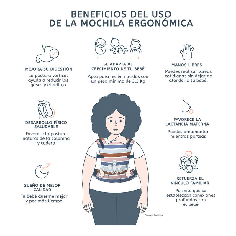Su estructura permite un ajuste personalizado tanto en lo alto como en lo ancho, favoreciendo la postura fisiológica natural del bebé, con las piernas en forma de “M” y la espalda en “C”, recomendada por expertos en desarrollo infantil. Esta posición no solo aporta comodidad, también puede ser un aliado en el tratamiento de displasia de cadera en etapas tempranas.