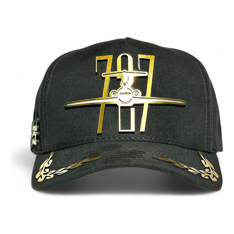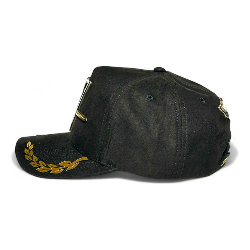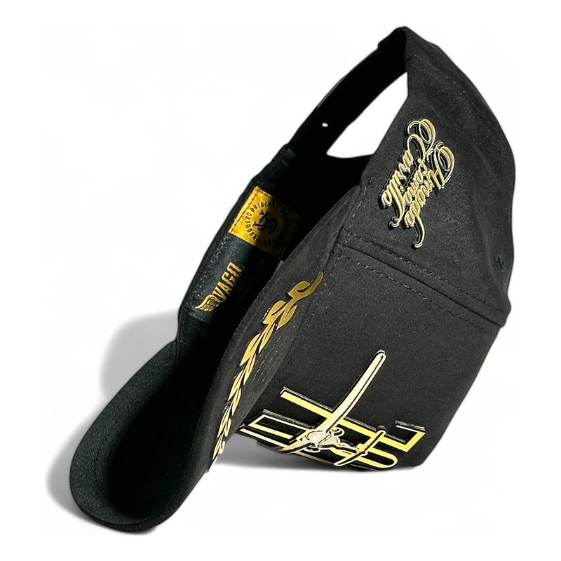 Gorra premium Vagostyle Amado Carrillo Gold, una pieza única que combina historia, elegancia y un diseño exclusivo. Esta gorra negra snapback está elaborada en gamuza negra de alta calidad, con detalles únicos como el avión Boeing 727 en una placa dorada, símbolo de poder y libertad asociado a la aviación.