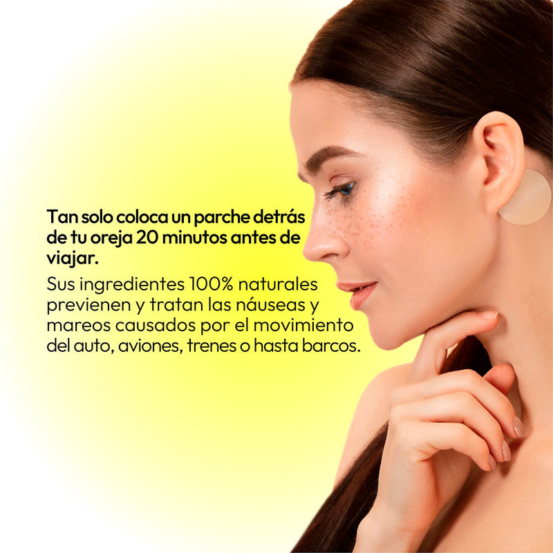 Modo de uso: despega y coloca un parche detrás de la oreja o sobre la muñeca, en piel limpia y seca, 10–15 minutos antes del viaje.